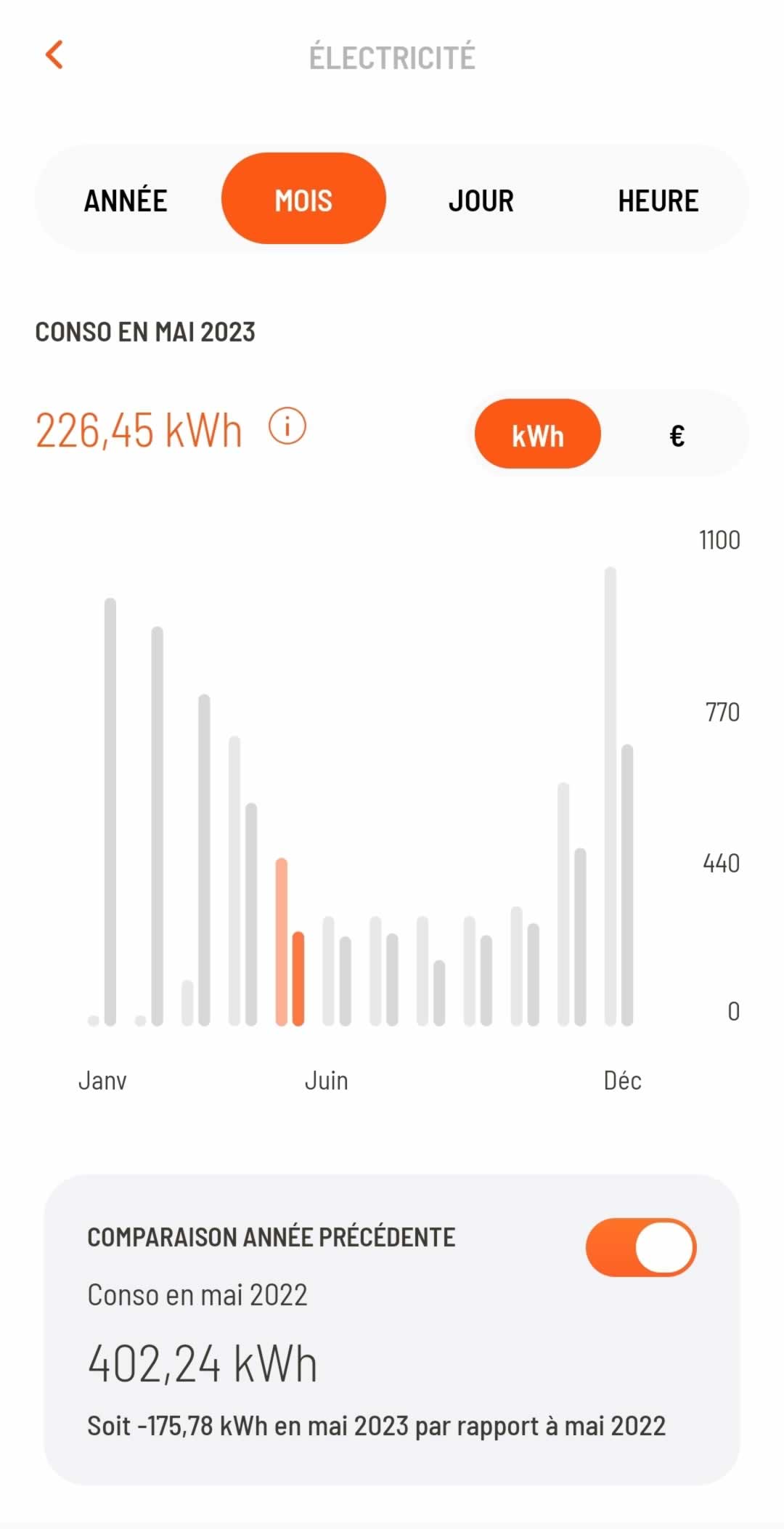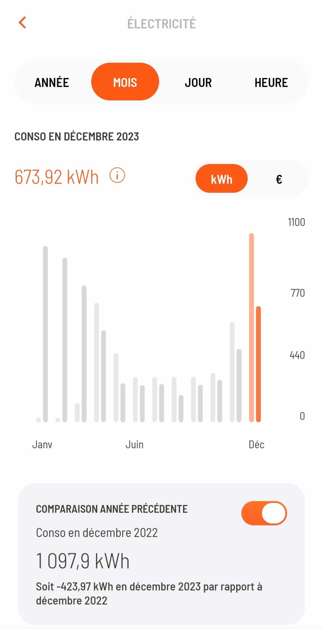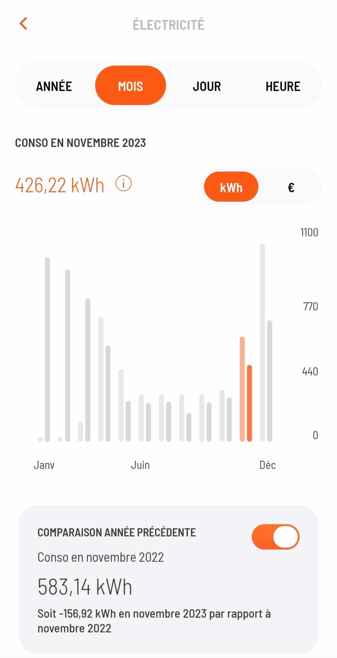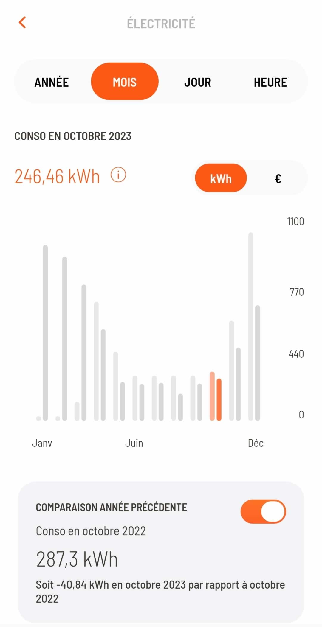 ◉ Pour vous donner une idée claire des économies, voici les consommations avant et après l'installation du plafond rayonnant sur une superficie de 40m² dans un appartement de 65m².