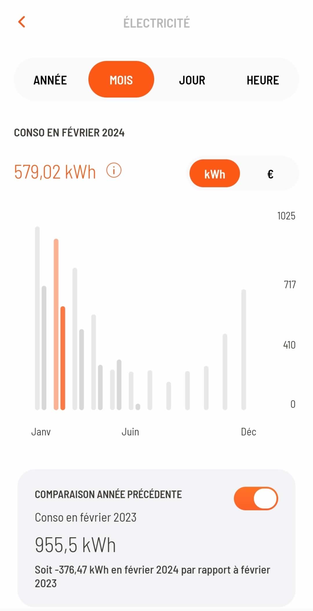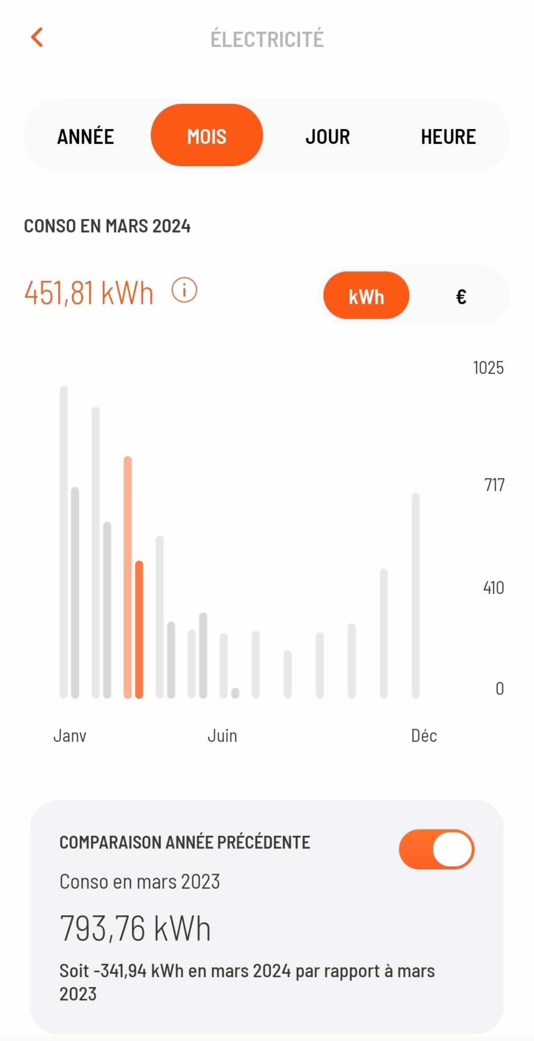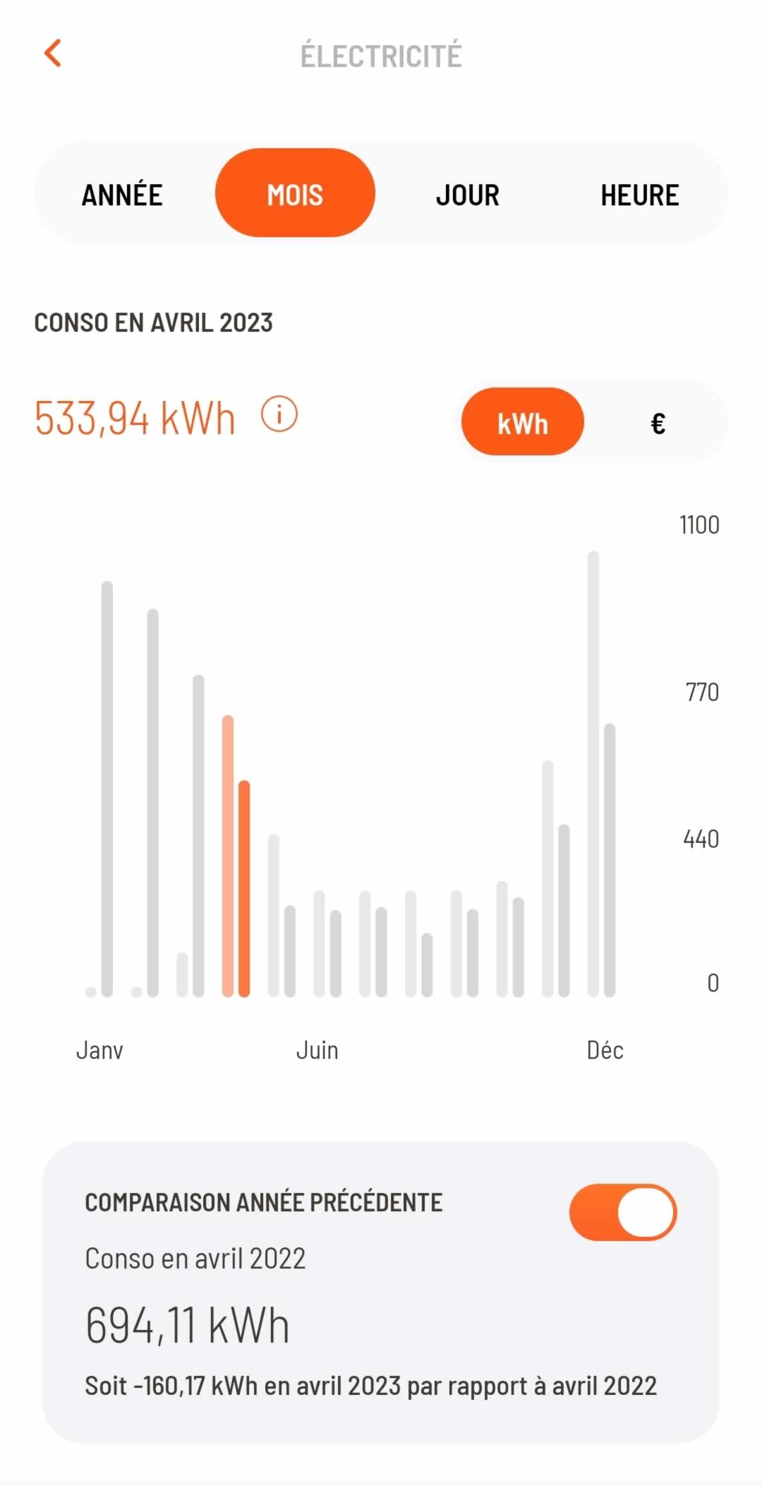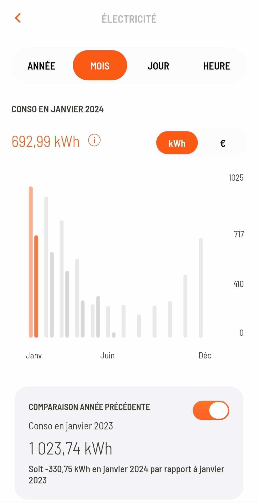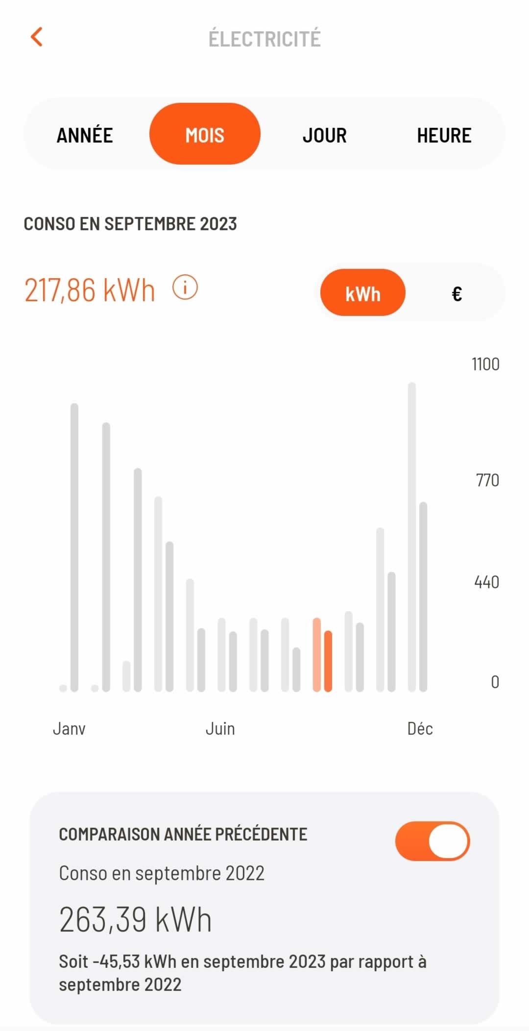 ◉ Pour vous donner une idée claire des économies, voici les consommations avant et après l'installation du plafond rayonnant sur une superficie de 40m² dans un appartement de 65m².